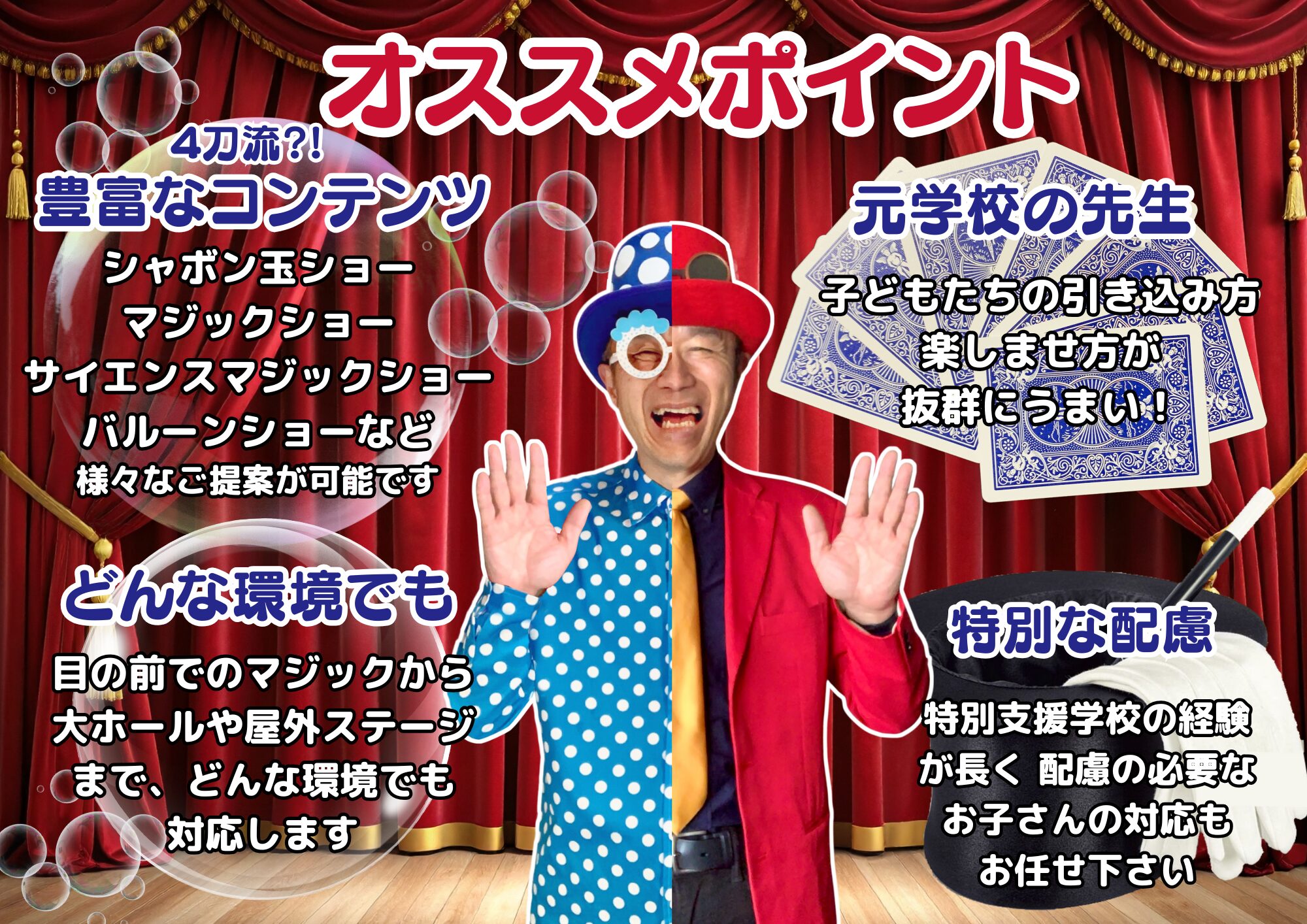 見る者を必ず笑顔にすることからついたあだ名が「笑顔泥棒」お子様からご高齢者までみんなが楽しめるイベント作りをお手伝いします。