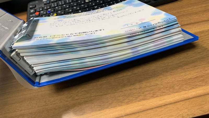 保育園・幼稚園・こども園にシャボン玉ショーやサイエンスマジックショーでうかがった時、可能であれば先生方に「感想カード」を書いていただいています。そのファイルがコチラ。 分厚いファイルにぎっしり感想カードが綴られています。 ずっしり重いい。ざっと数えてみたら2冊合わせて250枚以上ありました。 先日金沢市内の幼稚園へシャボン玉ショーに行った時に、ショーが始まっても座席に座れず、部屋の後ろの方にある「ろくぼく」という遊具に登って、上から見ているお子さんがいました。