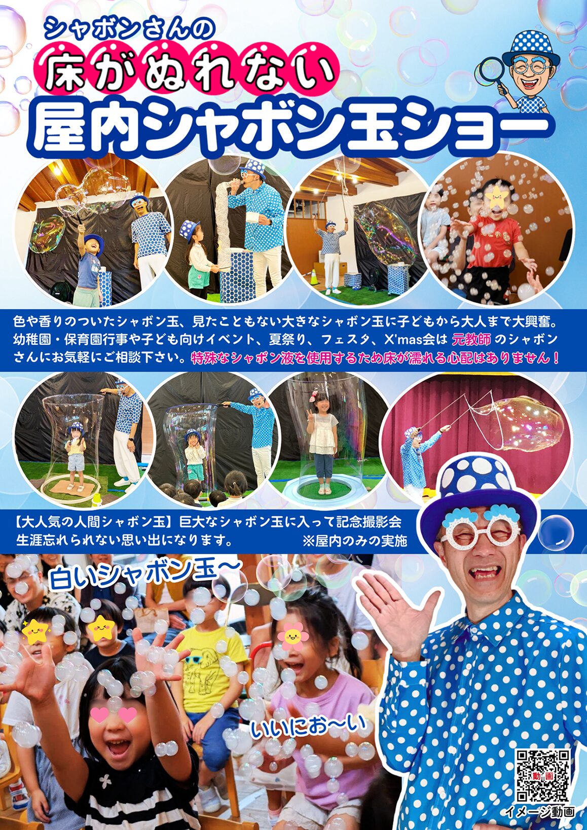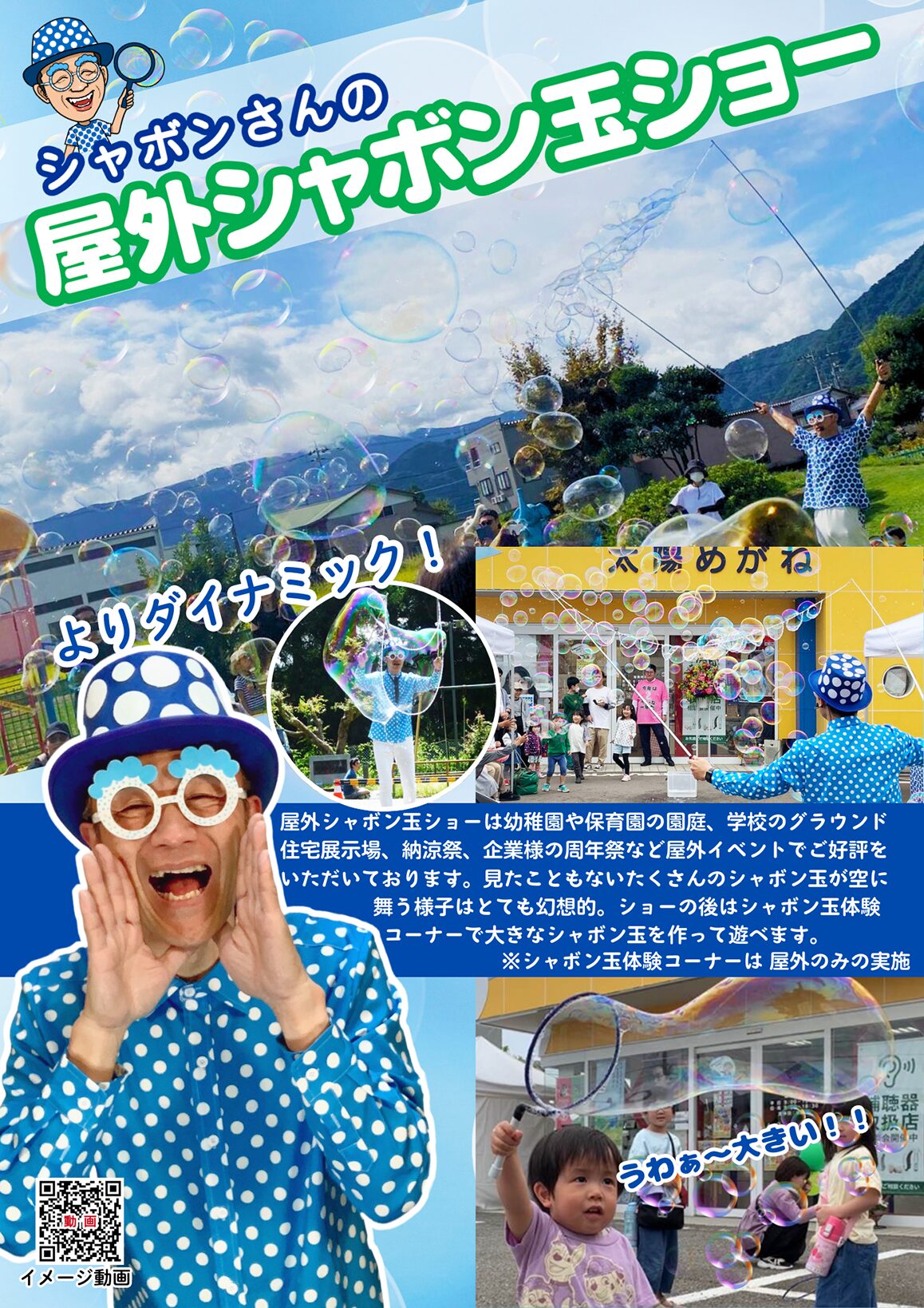 ※自由に大きなシャボン玉を作って遊べる『シャボン玉体験コーナー』は屋外シャボン玉ショー限定となります。